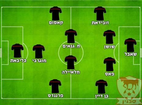 הרכב משוער: אחמד שאבל; מוחמד זובידאת, מור שושן, אברהם פאס, דדי בן דיין; חאלד חלאיילה, חמד גנאים, אחמד קאסום, מארק פרננדס; פיראס מוגרבי, מוחמד כליבאת.