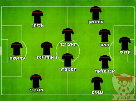 הרכב משוער: רן קדוש; עלי עותמאן, עלא אבו סאלח, אברהם פאס, חמד גנאים; דייגו קאצ'ובה, אלדר חסנוביץ', ז'אורז'יניו, צחי אליחן; פיראס מוגרבי, וויאם עמאשה.