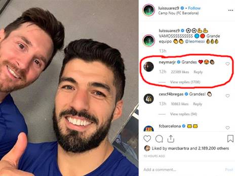 ומי עוד החמיא לברצלונה? לא אחר מאשר האקס ניימאר. סוארס העלה תמונה לאינסטגרם מחדר ההלבשה יחד עם מסי והכוכב הברזילאי הגיב לחבריו לשעבר לשלישיית ה-MSN: "גדולים".