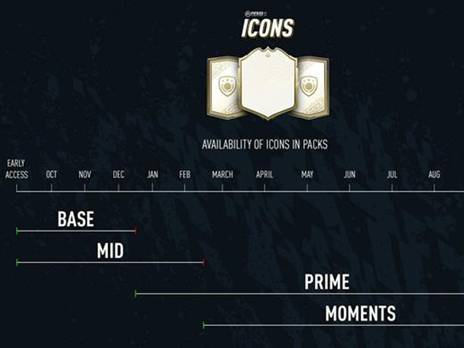 כל חלוקת שחקני האייקונים תפוצל על גבי ארבעה מחזורים שונים ותאריכים שונים במהלך השנה: את הקלפים הבסיסיים שמייצגים את השחקנים בתחילת הקריירה יוכלו להשיג השחקנים עד אמצע דצמבר, את קלפי ה-Mid  יוכלו השחקנים להשיג עד אמצע פברואר, את קלפי ה-Prime יוכלו להשיג מאמצע דצמבר, ועד סוף העונה, ואת קלפי ה-Moments יוכלו להשיג מאמצע פברואר עד סוף העונה של פיפ"א 20.
