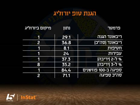 ארבעת הניצחונות שיפרו כמובן את מצבה של מכבי בטבלה, אבל גם במבט על של כל ששת המשחקים מכבי נמצאת בצמרת ברוב הפרמטרים ההגנתיים: היא ראשונה ביורוליג בריבאונד הגנה (29.1) ושנייה בריבאונדים בסך הכל (36.8); ראשונה בחטיפות (8.1), ונתון שמלמד על רמת הקשיחות - ראשונה בעבירות (24). אבל מעל הכל, נתון חריג ונדיר של 37.3% ל-2 שהיריבות של מכבי קולעות עליה. ממוצע היורוליג מהטווח הזה עומד על כ-51%, אבל מכבי מצליחה להוריד את יריבותיה לאחוז נמוך כל כך, והיא כמובן ראשונה ביורוליג בנתון הזה.