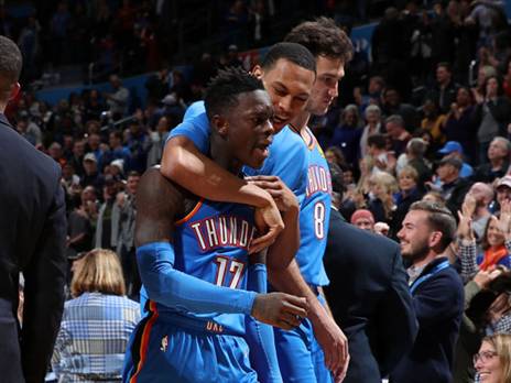 דרמת ענק שהוכרעה רק בתום הארכה, בין שתי קבוצות שמקוות להשתחל לפלייאוף במערב. למרות התוצאה הגבוהה הקבוצות נשארו צמודות לאורך כל המשחק המותח, 1.1 שניות לסיום קארל אנתוני טאונס העלה את מינסוטה ליתרון 2 נקודות ואוקלהומה הוציאה כדור מחלק המגרש שלה. סטיבן אדאמס במסירה א-לה גור שלף מצא את דניס שרודר שבליי-אפ זריז קלע שתי נקודות ושלח את המשחק להארכה כשהאצטדיון מתפוצץ מהתרגשות. בהארכה זה כבר היה סיפור אחר לגמרי ואוקלהומה סיטי המשיכה במומנטום מהסל המטורף וניצחה בזכות שמונה נקודות של שיי גילג'יוס אלכסנדר (מתוך 29 שהיו לו במשחק). כריס פול התעלה על עצמו שוב וסיים עם 30 נקודות ב-11 מ-20 מהשדה ודניס שרודר עלה מהספסל והיה מצוין עם 25 נקודות. אצל מינסוטה, עבורה היה זה הפסד שלישי ברציפות, ג'ף טיג קבע שיא עונתי עם 32 נקודות וטאונס הוסיף 30 שכאמור לא הספיקו להכריע את הדרמה האדירה.