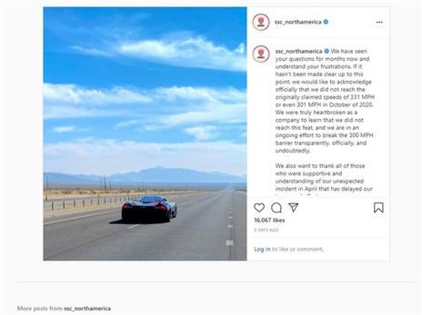 הודאת אשמה פורמלית של SSC כולל פוסט שפורסם באינסטגרם התחיל לשוטט בקהילות ובפורומים השונים לאחרונה. וכך דבר ההודעה: "ראינו את שאלותיך במשך חודשים ואנו מבינים את תסכוליך. אם לא היה ברור עד לנקודה זו, ברצוננו להכיר באופן רשמי שלא הגענו למהירויות שצוינו במקור של 331 מייל ו -301 מייל באוקטובר 2020. זה באמת שבר את ליבנו כחברה לגלות שאנחנו לא הצליח להשיג זאת...אנחנו מרכזים את כל המאמצים שלנו לפרוץ את מחסום 300 המייל בצורה שקופה, רשמית וללא עוררין".