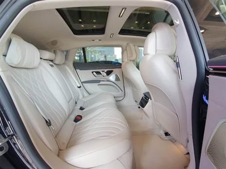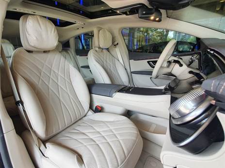 תא הנוסעים של ה-EQS משקף קפיצת מדרגה טכנולוגית חסרת תקדים בענף הרכב; בגרסה הבכירה ביותר, כל המערכת נשלטת דרך "הייפר-מסך" בגודל עצום של 56 אינץ' רוחבי, מחופה זכוכית ומורכב למעשה משלושה מסכי 17 אינץ' בטכנלוגית מגע וברזולוציה אולטרא חדה, אותו משלים מול הנהג לוח מחוונים 12.3 אינץ'. חווית המשתמש מופעלת באמצעות בקרת MBUX קולית (אינטילגנציה מלאכותית) שלומדת את הרגלי הנהג, סידור הישיבה שלו, מארגנת פעילויות מועדפות ומקומות מעניינים במערכת הניווט - הכול בהתאם לדפוסי הצריכה ומסלולי הנהיגה שלו. דגמים בסיסיים רק נעיר מסתפקים בצגים דיגטליים מסורתיים יותר, בסגנון ה-S קלאס הרגילה, עם מערכת מדיה ראשית 12 אינץ' בטכנולוגיית OLED, תצוגה עלית וכדומה.