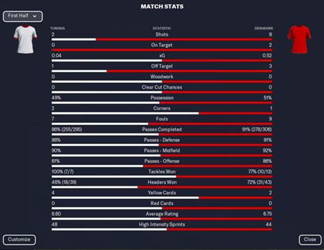 תוניסיה סיימה את המחצית עם שתי בעיטות לשער (אך לא למסגרת), וארבעה צהובים לעומת שניים של דנמרק. מחצית לא מהנה לצפות ויסלחו לנו הדנים והתוניסאים, גם מאוד משעממת. נקווה לשיפור היום אחר הצהריים.