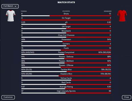 לרוע המזל, המחצית השנייה לא הייתה יותר טובה. תוניסיה המשיכה להסתגר, דנמרק תקפה והשתלטה על המשחק לחלוטין, ועדיין לא הצליחה לכבוש. מה נאמר? יש גם משחקים כאלה. נדרוש פיצוי משתי הנבחרות במשחק האמיתי.