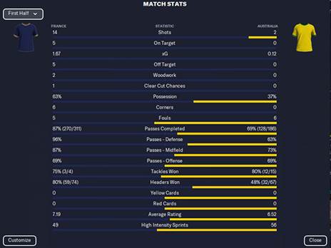 צרפת לא הרפתה, בדקה ה-30 כבר 2-0 לצרפתים אחרי גול של אנטואן גריזמן מקרוב אחרי מסירת רוחב של אדריאן ראביו. האוסטרלים המסכנים לא הצליחו להציג את הכדורגל שלהם בכלל. כ-14 בעיטות לשער במחצית של צרפת לעומת שתיים של האוסטרלים.