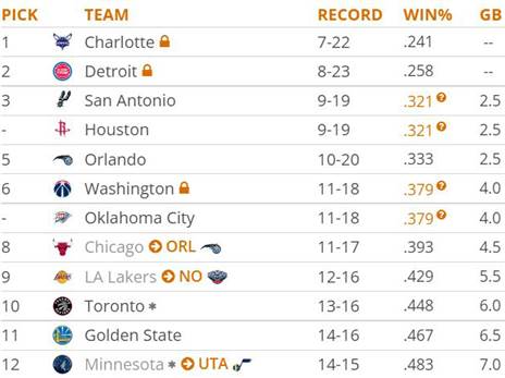 בחזרה להווה. לוושינגטון וויזארדס, בעקבות רצף שמונת ההפסדים שלה (11 ב-12 משחקים), יש סיכוי של 8.3% לזכות בלוטרי ולבחור בחודש את יוני את ויקטור וומבניאמה. לפתע וושינגטון היא קבוצת תחתית לכל דבר, אך העניין הוא שהיא לא מוכנה להכיר בזאת (כמו שיקגו), מה שיצריך אותה או לחזור למסלול הניצחונות או לבצע שינוי דרמטי.