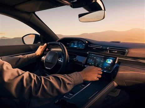 בתא הנוסעים אותה חווית "i-Cockpit" עם שיפורים וליטושים - מסך 12 אינץ' עם מצבי תצוגה שונים, ומסך מגע של מערכת מולטימדיה בגודל 10 אינץ'. מנהרת ההילוכים שונתה, עם ידית הילוכים אוטומטית זעירה, כפתור הפעלת הבלם המתחדש (B) -בגרסאות ה-PHEV וכן בורר מצבי הנהיגה והמתלים האדפטיביים. כמו כן, פיג'ו שמרה על מקשי הקיצור לפונקציות עיקריות, אך שינתה את מערכת המולטימדיה "i-Connect Advanced", כעת עם עד 8 פרופילים שונים, ועם מגוון רחב של ווידג'טים שניתן להתאים לפי ראות עיניכם.