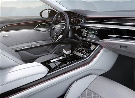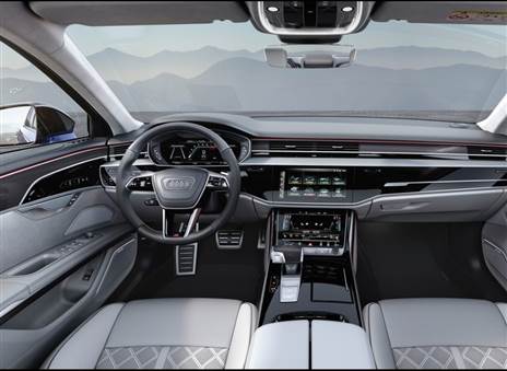 בחלל הפנים, על אורך של 5.2 מ' ובסיס גלגלים של 3 מ', תמצאו את מיטב השכלולים האחרונים של ה-A8 עם ממשק MMI מרכזי המבוסס על צגים דיגיטליים בקונסולה, במפלס התחתון ובלוח המחוונים. רכבי ה-S8 מגיעים עם אבזור מורחב ביחס ל-A8 שכולל בין היתר במת סאונד של באנג אנד אולפסן עם 17 רמקולים, הגה ספורטיבי ועוד. כמו כן, נכללת ברשימה תאורת LED מטריקס, מתלים אדפטיביים, מצלמות היקפיות, חיישנים היקפיים, ושלל מערכות הגנה אקטיביות.