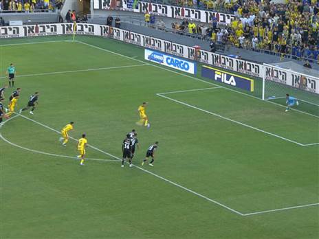 אז מדוע לא הוחלט על פנדל חוזר למכבי ת"א? לפי החוקה, מספיקה רגל אחת של השחקן על קו הרחבה על מנת שלא ייחשב מעורב במהלך. בתמונה שניתן לראות לפניכם אפשר לראות ששחקני הפועל פ"ת אכן עם רגל אחת על הקו בעוד שבנוגע לדרור ניר (מספר 23) הורד אנך שמעיד שהעקב שלו היה על קו הרחבה.