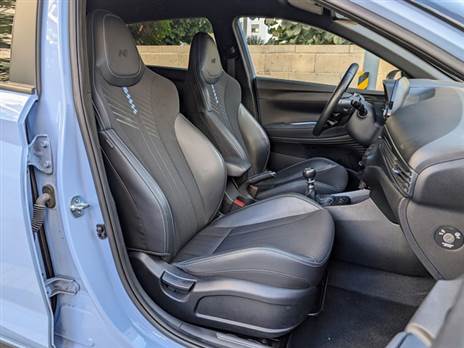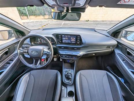 עיצוב הפנים לעומת זאת פחות צעקני. פרט למושבים הספורטיביים עם רקמת התכלת (שלבסוף מתיישבים עליהם ולא רואים עוד), תא הנוסעים זהה לגמרי לגרסה הרגילה וחבל. גווני שחור שולטים ואיכות החומרים בסיסית לגמרי. פס כחול או אדום לרוחב הדשבורד ובדלתות היה משדרג את האווירה במקצת, במקום זה תסתפקו בתגית N קטנה בידית ההילוכים ובחישור האמצעי שבהגה, שם גם שוכנים שני כפתורי N תכולים וכפתור ה-Rev Match אדום, שעוד נרחיב עליהם בהמשך.