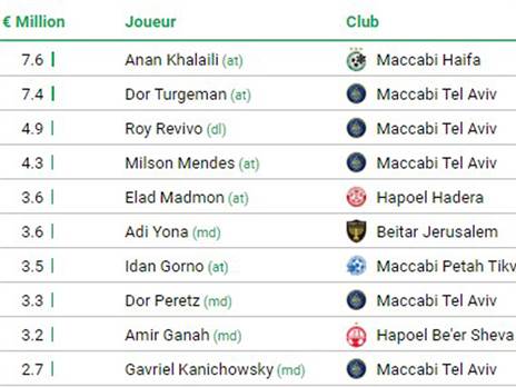 ענאן חלאיילי הוא השחקן בעל השווי הגבוה ביותר עם 7.6 מיליון יורו. מיד אחרי, בפער של 200 אלף יורו בלבד נמצא דור תורג'מן (7.4) ואת השלישייה נועל שחקן נוסף של מכבי תל אביב - רוי רביבו (4.9 מיליון יורו).