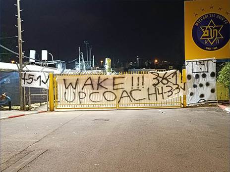 תחילתה של מחאה במכבי תל אביב? אחרי שריקות הבוז בסיום משחק שמינית גמר הגביע באמצע השבוע, אז הודחה הקבוצה נגד מכבי בני ריינה - הערב (שישי), יממה לפני משחק הקבוצה נגד מכבי נתניה, נתלו שלטים על שערי הכניסה למתחם האימונים של הקבוצה בקריית שלום שקראו - "המאמן, תתעורר".