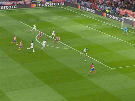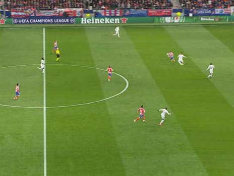 1. קלמן לנגלה שולח כדור ארוך עד לקו ההגנה של ריאל, המטרה של אתלטיקו הייתה להשתלט על הכדור השני שניתז מראול אסנסיו והיא עושה זאת באופן מושלם עם קונור גלאגר.