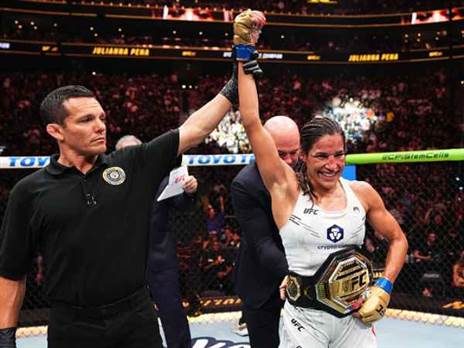 היא הייתה זו שהפילה את אמנדה נונס והיום היא הייתה זו שהפילה את ראקל פנינגטון. ג'וליאנה פנייה סיימה כמנצחת בסיומו של קרב צמוד ושקול, שהתחלק כמעט שווה בשווה בין הצדדים. פנייה תפסה לא פעם את האלופה היוצאת עם טייקדאון והיא מצידה סיפקה נוקדאון גדול ומספר בעיטות שהיממו את הקונטנדרית. עם זאת, בסופו של דבר הניצחון בהחלטה חצויה הלך לכיוון האלופה לשעבר, שהפכה לאלופה המכהנת פעם נוספת. צפו בקרב>>>
