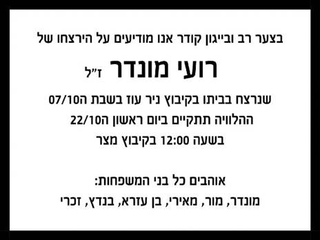 הלוויתו של רועי מונדר ז"ל, תתקיים ביום ראשון בשעה 12:00, בקיבוץ מצר.