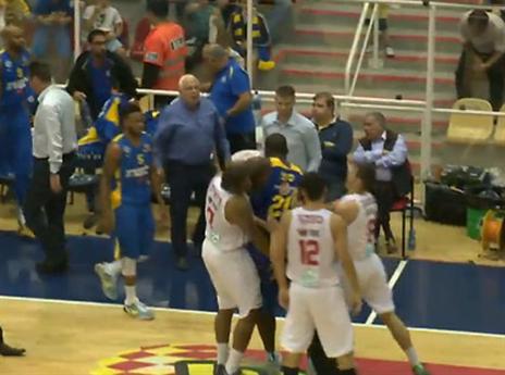 האורחים פתחו פער של 6 נקודות, אבל שחקני גלבוע הגיבו בריצת 0:8 והפכו בדרך ל-15:15 בסיום הרבע הראשון. המקומיים ברחו ליתרון 8, לפני שלחימה של מכבי בריבאונד התקפה איפשרה לה לסגור את הפער. גליל שוב רצה ל-31:39, גודס לקח פסק זמן ובירידה סופו חבט פעמיים בפניו של מרכוס לואיס בעזרת המרפק. על הפרקט החלה מהומה, כאשר חואקין שוכמן דחף את היווני מאחור. השופטים התייעצו והרחיקו את סנטר מכבי ת"א. ההפרש קפץ ל-12 ובהפסקה 33:43 למארחת.