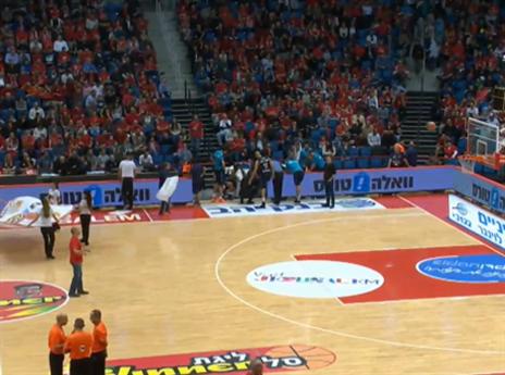 צפו: אוהד של ירושלים קולע מחצי מגרש בהפסקה