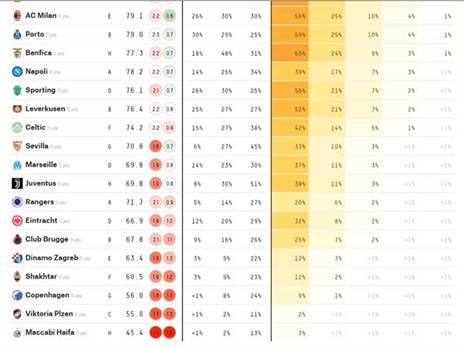 נתחיל מהסוף - הירוקים, יחד עם 14 קבוצות נוספות, נמצאים בתחתית עם פחות מ-1% לזכות באלופות, כאשר השתיים התחתונות ביותר הן מכבי חיפה ו-ויקטוריה פלזן. לאלופה הישראלית, שנמצאת בבית קשה במיוחד שכולל את פ.ס.ז', יובנטוס ובנפיקה, יש 3% לעלות לשלב שמינית הגמר, בעוד לצ'כים, שנמצאים בבית המוות יחד עם באיירן מינכן, ברצלונה ואינטר, 2% להעפיל לשמינית.
