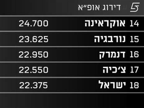 כרגע, בחישוב 4 העונות האחרונות (החישוב הוא על פי 5 עונות, כשהעונה הנוכחית עוד לא התקיימה), ישראל עם 22.375 נקודות, צ'כיה מקום אחד למעלה עם 22.550, דנמרק במקום ה-16 עם 22.950 ונורבגיה 15 עם 23.625. אגב, במקום ה-14 אוקראינה, שנחלשה מאוד בשל המלחמה במדינה.