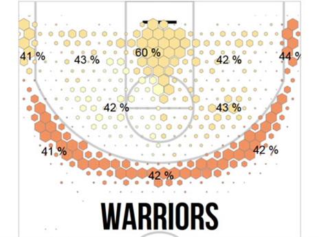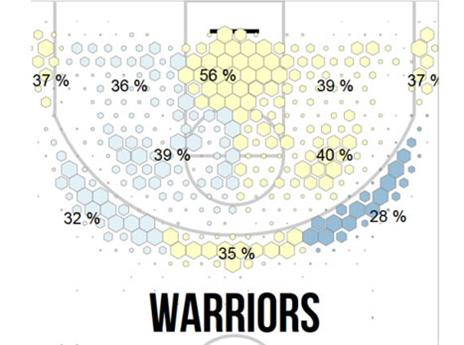 בפינה הכחולה-צהובה: גולדן סטייט ווריירס. קבוצה יעילה עם כמה מכות קטלניות. אלה לא רק השלשות של סטף קרי, זה גם הפיק'נ'רול בין קרי לדריימונד גרין, שנחשב לאחד המהלכים הקטלניים בליגה, ומותיר בפני המגן את ברירת ה"בחר את הרעל שלך". האם לצאת לקרי למנוע שלשה ולהסתכן בחדירה? לשמור מפני חדירה ולהסתכן בשלשה של קרי? האם השחקן השני יגיע לעזור ולהשאיר את גרין לבד? (זו בדר"כ האופציה הנבחרת, ולא, זה עדיין לא עוזר). הווריירס מאוד יעילים התקפית מכל מקום במגרש כפי שניתן לראות במפה הזו: