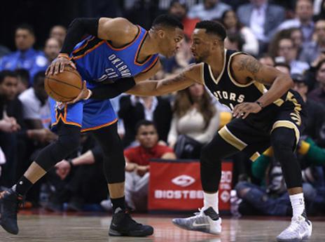 ראסל ווסטברוק רשם טריפל דאבל רביעי ברציפות ו-34 לעונה, 7 בלבד מהשיא של אוסקר רוברטסון כשנותרו 14 משחקים לעונה. הת'אנדר נהנו מערב מצוין מכל הטווחים, שסייע להם לעלות פעמיים ליתרון דו ספרתי במחצית הראשונה, שהסתיימה ב-48:58. ווסטברוק הסתייע בחבריו לחמישייה, כולם בדאבל פיגרס, כדי להגדיל את הפער לאזור ה-20 ו-5 נקודות של דומנטאס סאבוניס לקראת סוף הרבע השלישי הפכו את 12 הדקות האחרונות לגרבאג' טיים עם יתרון 70:97 מוחץ.