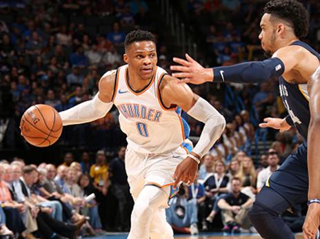 ראסל ווסטברוק הגיע למשחק בתקווה להשיג 16 ריבאונדים ולהבטיח עוד עונה, שנייה ברציפות, עם ממוצע טריפל דאבל. הת'אנדר קיוו להשיג ניצחון שישאיר להם סיכוי ליתרון ביתיות בסיבוב הראשון. שני הדברים הללו הושגו בלי שום בעיה, כאשר ווסטברוק בקושי זורק, מתמקד בריבאונדים ומגיע ל-16 שלו כבר ברבע השלישי, בעוד OKC מובילה כמעט לכל אורך המשחק. ה-MVP היוצא סיים עם 6 נקודות בלבד, לצד 19 אסיסטים ולא פחות מ-20 ריבאונדים. פול ג'ורג' הפגיז 40 נקודות, דילון ברוקס צלף 36 עבור הגריזליס.