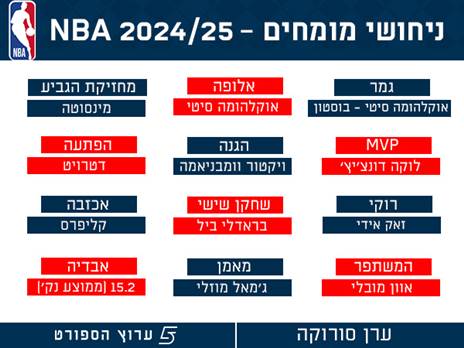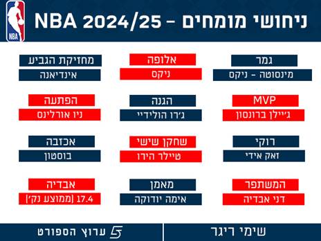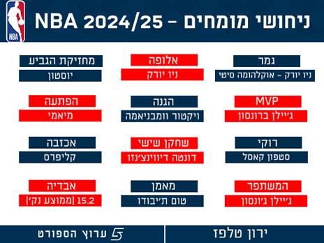 רגע לפני, כמיטב המסורת, שאלנו את מומחי ה-NBA שלנו מה התחזיות שלהם לעונה - וקיבלו תשובות חלוקות מהרגיל, שרק מעידות איזו עונה מרתקת עומדת בפנינו. מהאלופה, דרך ה-MVP ועד ממוצע הנקודות של דני אבדיה, שקלע 14.7 אשתקד. התחזיות לפניכם: