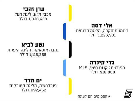 סוגרים את העשירייה גדי קינדה, ששכרו גלוי בשל מדיניות השכר ב-MLS וים מדר, שהשתדרג משמעותית בשל המעבר מפרטיזן בלגרד לפנרבחצ'ה. יש לציין כי הקיץ עדיין לא נגמר, ועוד שחקנים ישראלים יכולים לעבור, כך שהרשימה עוד עשויה להתעדכן.