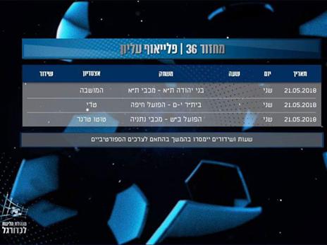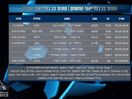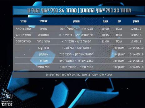 שבוע לאחר מכן, הפועל ב"ש תארח בטרנר את מכבי ת"א ביום שבת (12 במאי) בשעה 21:00. משחקי הפלייאוף העליון במסגרת המחזור ה-33 טרם נקבעו ויחולקו בין הימים ראשון ושני. המחזור ה-35 בפלייאוף העליון יתקיים באמצע השבוע (15 במאי) עם שני משחקים, כאשר במוקד מכבי ת"א תארח את בית"ר ירושלים. נתניה ובני יהודה יסגרו את המחזור כ-24 שעות לאחר מכן.