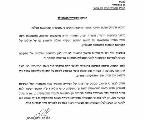 לאוהדי מכבי תל אביב יש סיבה לחשש. היום (רביעי) שלח מנכ"ל עיריית ת"א, מנחם לייבה, מכתב חריף, בעקבות הנחייה של היועץ המשפטי, לבן מנספורד, מנכ"ל הצהובים, בנוגע לאצטדיון בלומפילד. אחרי שגורמים בכירים במכבי שלחו הערות לטיוטת חוזה ההרשאה והשימוש באצטדיון, כתב לייבה למנספורד את עמדתו החדשה, שבעצם משנה במעט את התמונה לקראת העונה הבאה.