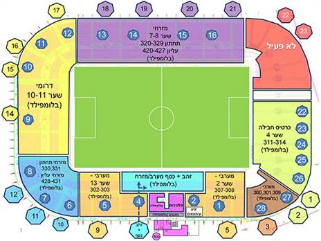 המנויים לשער 10-11 יישבו ביציע הדרומי בשערים 14-17 בעוד שבדומה לבלומפילד, גם בטדי יישבו יחד המנויים לשערים 7 ו-8, הפעם ביציע המזרחי בשערים 13-16. יושבי שערי 2 ו-13 באצטדיון בלומפילד יאכלסו את היציע המערבי בשערים 1-2 ו-4-5 בהתאמה.