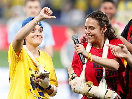 אמילי דמארי אמרה: "אני רוצה להגיד תודה רבה, גם למכבי ת"א וגם להפועל חיפה, גם לכל האוהדים. תודה שנלחמתם עלינו, צריך להילחם על כל שאר החטופים שחזרו מעזה. אחים ואחיות ששלי מהיציע, משפחת מכבי יקרה. לא מוצאת את המילים. כשהייתי בימים החשוכים ביותר בשבי עזרתם לי, כששמעתי בשבי ברדיו שלקחנו אליפות, צרחתי גם כשהיה לי אסור. כשחזרתי שמעתי על המאבק שלכם. על השלטים והקריאות, לא ויתרתם. מכבי זה משפחה, הוכחתם את זה כל רגע. אבל הלב שלי כבד. כבר 526 ימים שגלי וזיוי עדיין חטופים בעזה. אני עומדת כאן היום ונשבעת - לא נעצור עד שהם ישובו הביתה. המאבק לא נגמר. כעמו מכביסטים אמיתיים נמשיך להילחם בכל הכוח והנשמה עד שכולם יחזרו. זו המשמעות האמיתית של נאמנות, של אחדות, של לב צהוב אמיתי".
