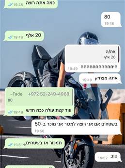 ועכשיו לסיפור של ידין טל מפתח תקווה, שבבעלותו ב.מ.וו S 1000 RR ספורטיבי, נדיר ויקר, לאחר שקם בבוקר והתממש הסיוט הגדול ביותר של כל בעל אופנוע – לגלות שהוא לא נמצא. הוא פנה למשטרת ישראל והגיש תלונה, וכבר אז אמרו לו שאם הכלי הגיע לשטחים – אין למשטרה יכולת לסייע בכך. אין להם סמכות לטיפול בכל מה שמעבר לקו הירוק. מספר ימים לאחר מכן הוא קיבל הודעות לוואטסאפ, עם תמונות של האופנוע ותחילת משא ומתן לתשלום כופר בסכומים שמתחילים ב-70 אלף ש"ח, ובתמורה יוחזר לו האופנוע.