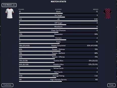 מחצית ראשונה שקולה. הפולנים פתחו קצת יותר טובה ממקסיקו אך לא הצליחו לתרגם את זה לשער, חוץ מקורה אחת של רוברט לבנדובסקי. ככל שהזמן עבר במחצית, מקסיקו התחילה להיכנס לקצב ולקחת על עצמה את המשחק. החברה בירוק הצליחו להחזיק בכדור 58% מהזמן במחצית, שבסופה גם הצליחו להבקיע.