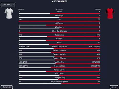הקנדים הראו שהם לא פראיירים וחזרו אחרי 2 דקות עם גול של מארק אנתוני קיי בנגיחה אחרי קרן של ג'ונתן אוסוריו. מחצית נפלאה של שתי הנבחרות. בלגיה הקבוצה היותר טובה על הדשא. קנדה לא מתבטלת ומנסה להילחם עם כלים שנמצאים ברשותה.
