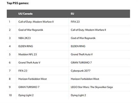 נתחיל עם טבלת מכירות המשחקים על הפלייסטיישן 5 בצפון אמריקה וכן באירופה. ובכן ביבשת הישנה (אירופה), בדומה לשנת 2021, שני המקומות הראשונים נתפסו על ידי חברות EA ואקטיוויז'ן. פיפ"א 23 לקח את המקום הראשון בטבלה, בדומה לשנה שעברה שבה משחק הכדורגל נמצא גם בטופ.