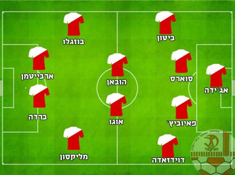 הרכב משוער: דניאל ליפשיץ; גיא ליפקה, בן והבה, יקיר שינה, לואי טאהה, אמבולה; בן בנימין, פטראצי, סער בנבנישתי; צ׳אם מאמדו, טוני וואקמה. {רועי זריהן}