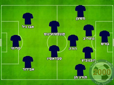 ההרכב המשוער של מכבי פ"ת למשחק מול הפועל ת"א: צחי גיגי; נאור פסר, דניאל דימוב, חגי גולדנברג, עומר דנינו, דדי בן דיין; גידי קניוק, בריאן גרזיצ'יץ', יובל יעקובוביץ'; גיא מלמד, יואכים מונונגה. [רועי זריהן]