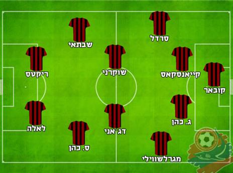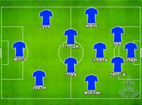 הרכב משוער: רן קדוש; עלי עותמאן, אברהם פאס, עלא אבו סלאח, איגור יובאנוביץ', מיחה מביליה, חאלד חלאילה, יאניס פפאדופולוס; פיראס מוגרבי, אחמד אבו נהייה, מילאן בויוביץ'. [תומר לוי]