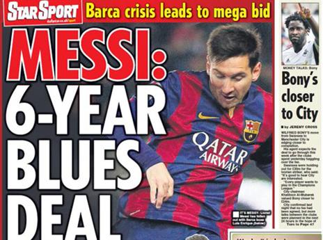 ואי אפשר בלי לספר על הצהובונים בלונדון, שרק חולמים לראות את ליאו מסי בצ'לסי. הנה השער של סטאר ספורט הבוקר: צ'לסי מוכנה לשלם 200 מיליון פאונד על ליאו מסי, שיקבל חוזה לשש שנים. גם אם זה לא נראה אמין בשום צורה, זה עדיין עיתון שתשלמו עליו 50 פני. מה לא?