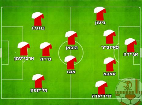 זה ההרכב שתירגל אלישע לוי לפני המשחק החשוב מול מכבי חיפה: אוסטין אג׳ידה, בן ביטון, טומיסלאב פאיוביץ׳, לואיי טאהא, אופיר דוידזאדה, אובידיו הובאן, ג'ון אוגו, מאור מליקסון, מאור בוזגלו, אליניב ברדה ושלומי ארבייטמן [רועי זריהן]