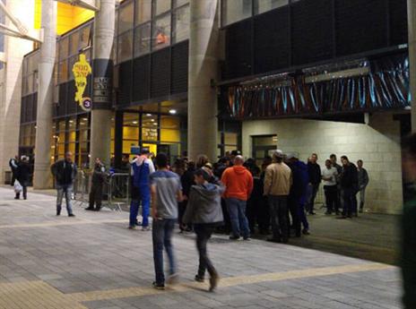 אוהדי בית"ר המזוהים עם ארגון "לה פמיליה" הגיעו לאיצטדיון והתאספו ליד הכניסה לשער הכבוד