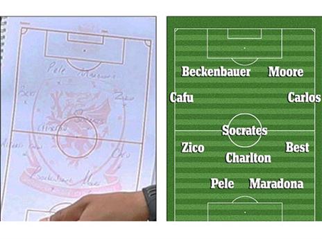 בהמשך לתמונת ההרכב של אנגליה שנחשפה ב"סאן", הנה התגובה המשעשעת של נבחרת וויילס. מאמן הוולשים כריס קולמן הקפיד להחזיק מחברת משלו באימון היום, רק שבמערך שלו נכתבו שמות אגדיים כמו פלה, מראדונה ובקנבאואר. מה יגיד רוי הודג'סון?