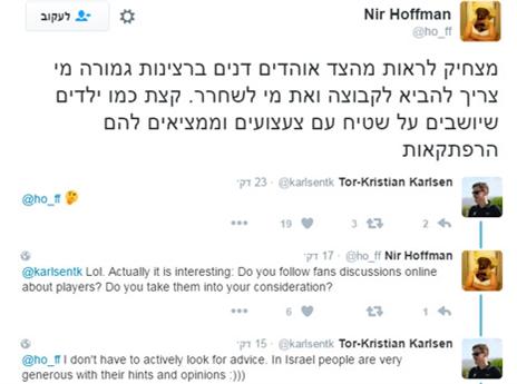 שיחה מעניינת התפתחה בטוויטר בין אוהד חיפה לטור כריסטיאן קרלסן, המנהל המקצועי של הירוקים. בציוץ הארוך יותר שלו כתב קרלסן: "בישראל האנשים מאוד נדיבים עם הרמיזות והדעות שלהם", כתב בציניות.