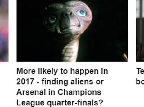 ולענייננו. ארסנל תגיע הערב (שלישי) לאיצטדיונה הביתי עם סיכויים אפסיים להעפיל לרבע גמר ליגת האלופות. החניכים של ארסן ונגר ינסו לעמוד במשימה כמעט בלתי אפשרית: למחוק פיגור 5:1 מול באיירן מינכן האימתנית. בתקשורת הבריטית כמובן לא מפספסים את ההזדמנות ללעוג לתותחנים, וב-BBC פרסמו "ידיעת סיכויים" וכותרתה: מה יותר סביר שיקרה: מציאת חייזרים או העפלה של ארסנל לרבע?