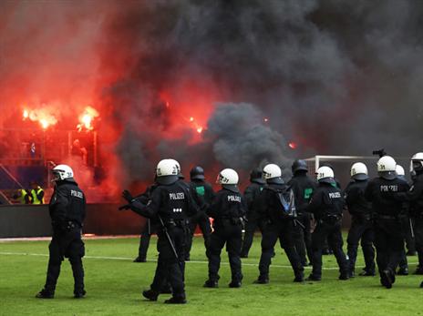 אוהדי המבורג מבעירים אש ביציע, אירועים מכוערים קורים כאן. השעון ממשיך לתקתק, אבל השאלה אם השחקנים יחזרו לכר הדשא