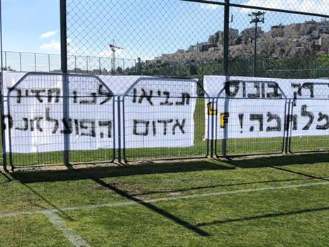 זה מה שחיכה הבוקר לשחקני בית"ר ירושלים באימון. שלטים בגנות הפועל ת"א: "תביאו לנו חזיר אדום. הפלייאוף רק בונוס"