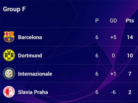 הערב הראשון של מחזור הסיום בשלב הבתים של ליגת האלופות הגיע הערב (שלישי) לסיומו, ובבית 6 זה נסגר עם דרמה לא קטנה. ברצלונה, שכבר הבטיחה את המקום הראשון, הדיחה את אינטר עם 1:2 בסן סירו, ובורוסיה דורטמונד הצטרפה אליה בשמינית הגמר עם 1:2 משלה על סלביה פראג.